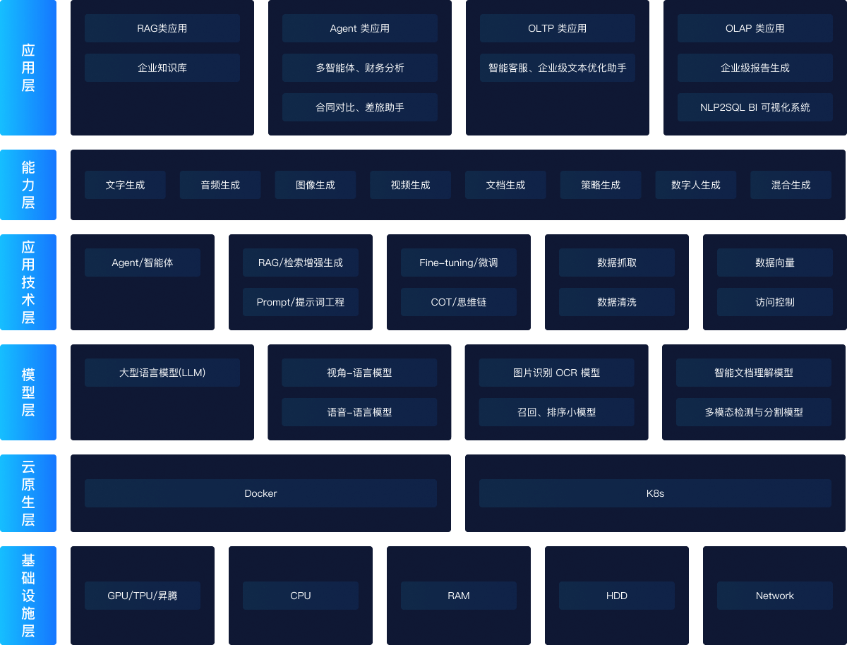 在企业级AI创新应用定制中,我们融合多种前沿模型,如语言、图文、音频、视频模型等,为企业提供强大的自然语言处理、内容生成、智能交互等定制化服务。