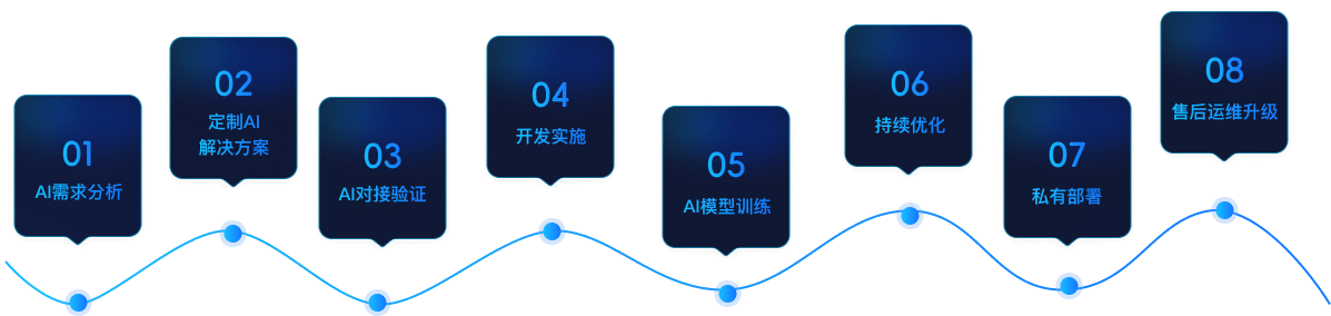 从需求梳理、深度的业务诊断,到精心定制AI解决方案,再到严谨的开发实施与持续优化,我们始终伴您左右,确保每一环节都与您的业务紧密结合,扩大AI技术的价值。