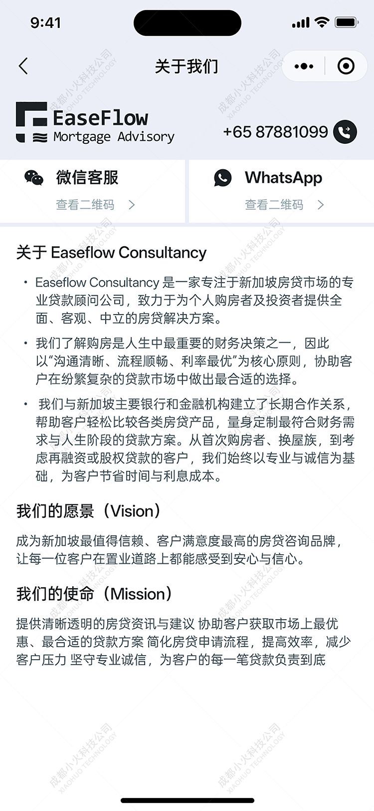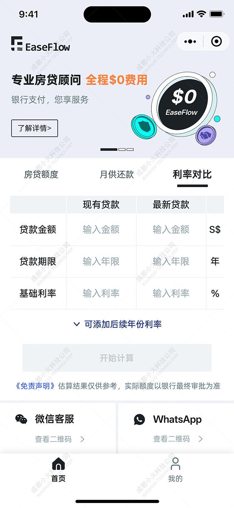 这是成都小火科技公司给新加坡Easeflow Consultancy房产企业开发的海外版微信(wechat)小程序。这套小程序是以房贷为核心,包含房贷计算,房贷额度申请,房贷月供演示,房贷详情查看等功能。