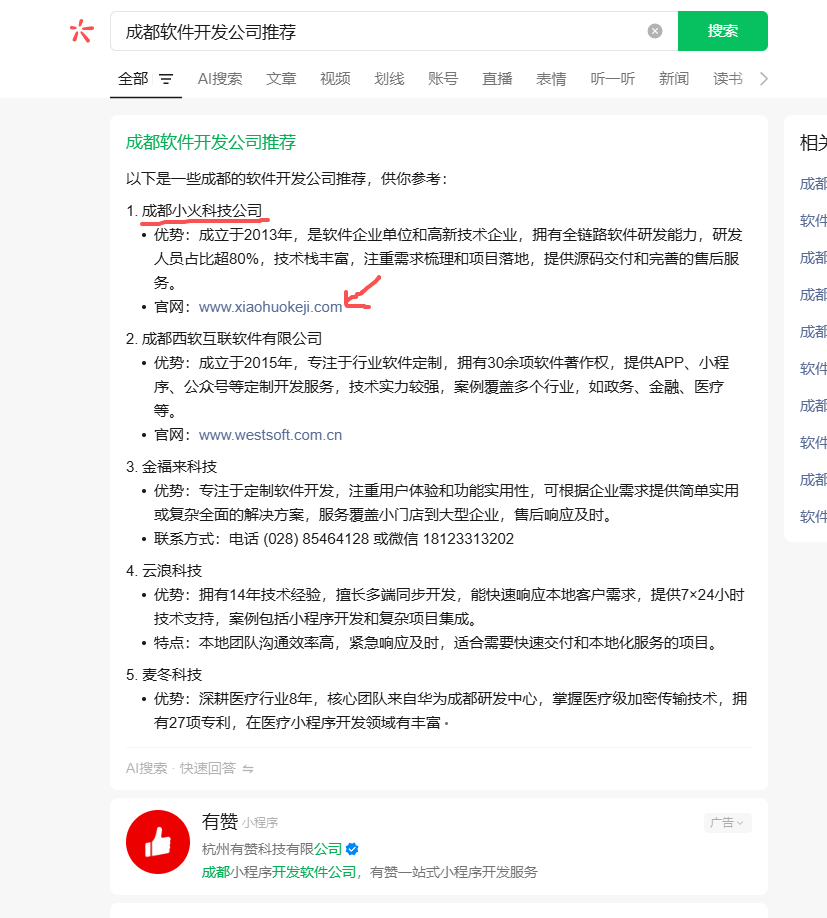 AI时代下,我们要利用好AI检索工具。今天是2025年9月11日,星期四。可以这样讲,AI出现之后,我们的大部分问题,都能够通过AI搜索来得到解决。今天我们以微信的AI搜索为例,给大家介绍AI检索成都软件开发公司的全流程。整个过程只需要两步,第一步,在手机微信搜索里面输入:成都软件开发公司推荐。